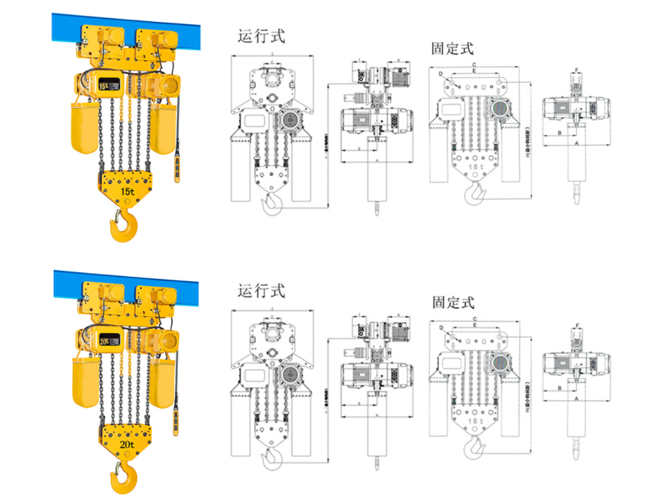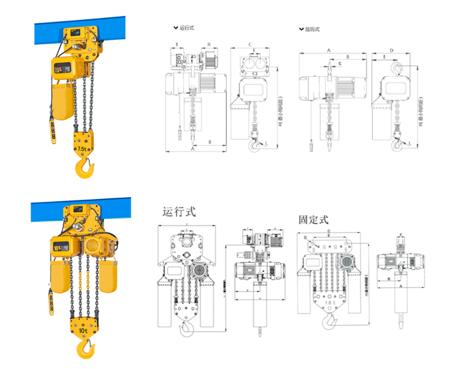 運行式環(huán)鏈電動葫蘆(7.5T-50T)尺寸參數(shù): | ||||||||